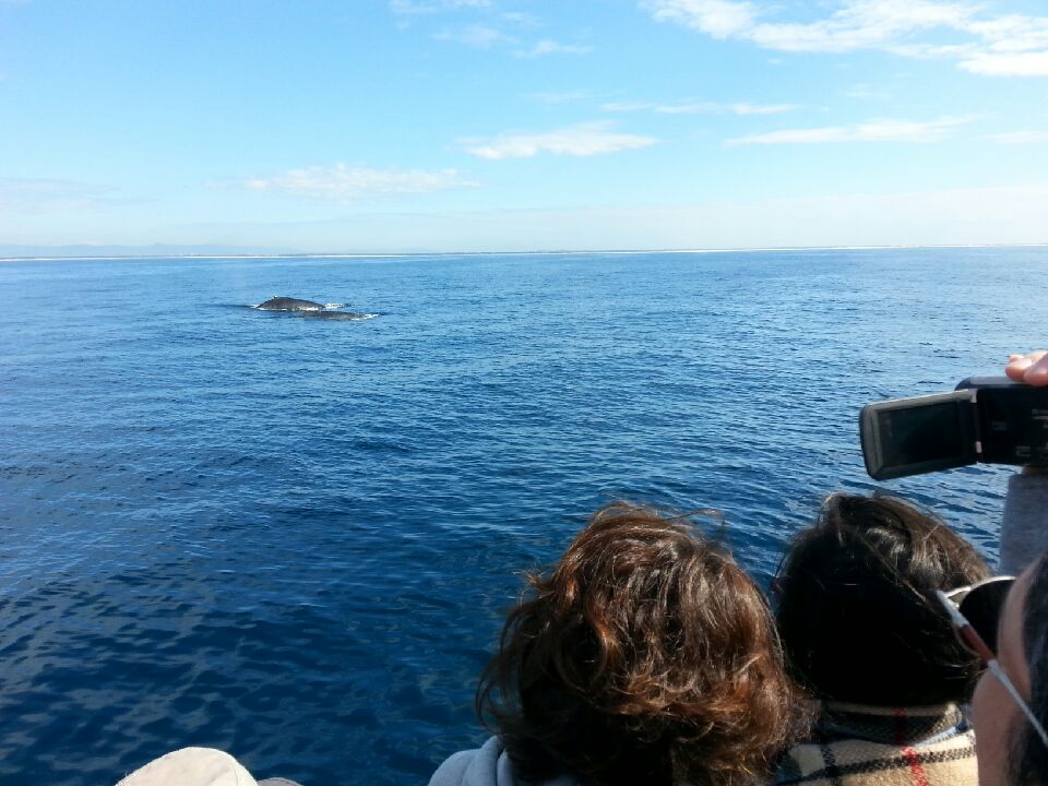 朝は曇っていましたが、次第に晴れて、波も穏やかで最高のコンディションでした。外海に出てしばらくすると第一クジラ発見。しかし先を急いでいるのか、特にアクションはなく北上していきました。その直後、またしても北上するクジラと遭遇。さっきのクールなクジラを違って、とっても元気!1時間くらい、ブリーチング、ペックスラッピング、テールスラッピングなど技を披露してくれました。船にかなり近づいてくれたので、大迫力のクジラショーとなりました!