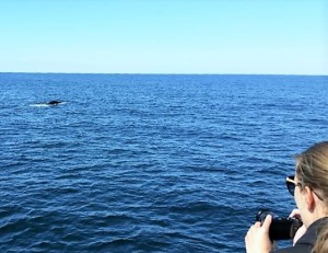 朝はちょっと風が冷たく、船は少し揺れましたが、皆様船酔いされることなく、元気にクジラを探されていました。クジラはコンスタントに表れ全部で12頭ほど見かけましたが、内気なクジラたちで、船が近づくと姿を消すというのを繰り返していました。タイムアップして船が港に向かっている最中に、ようやく2頭のクジラが船に接近してくれました。